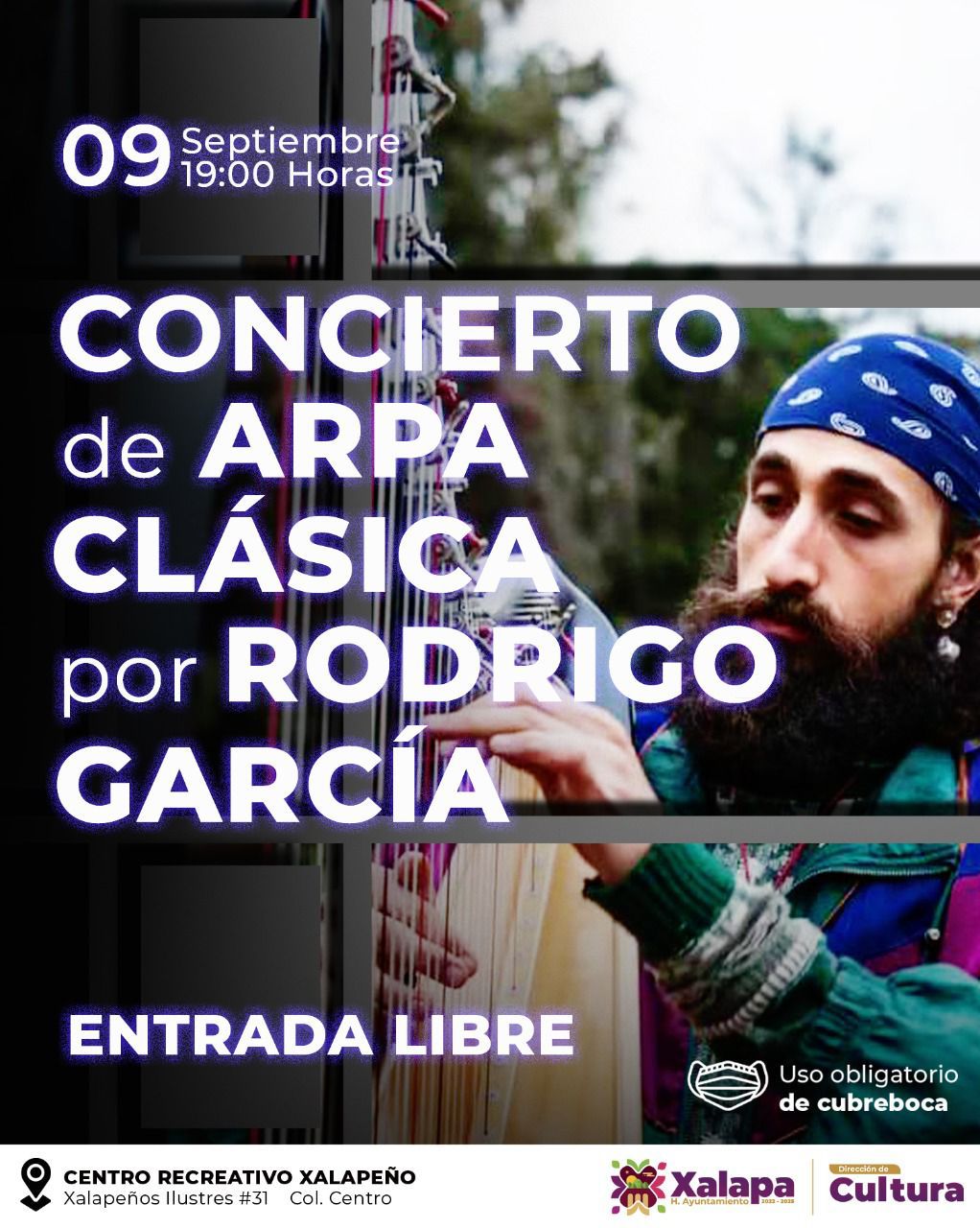 Para el viernes 9 de septiembre a las 19:00 horas, en el CRX se realizará un concierto de arpa clásica a cargo de Rodrigo García.