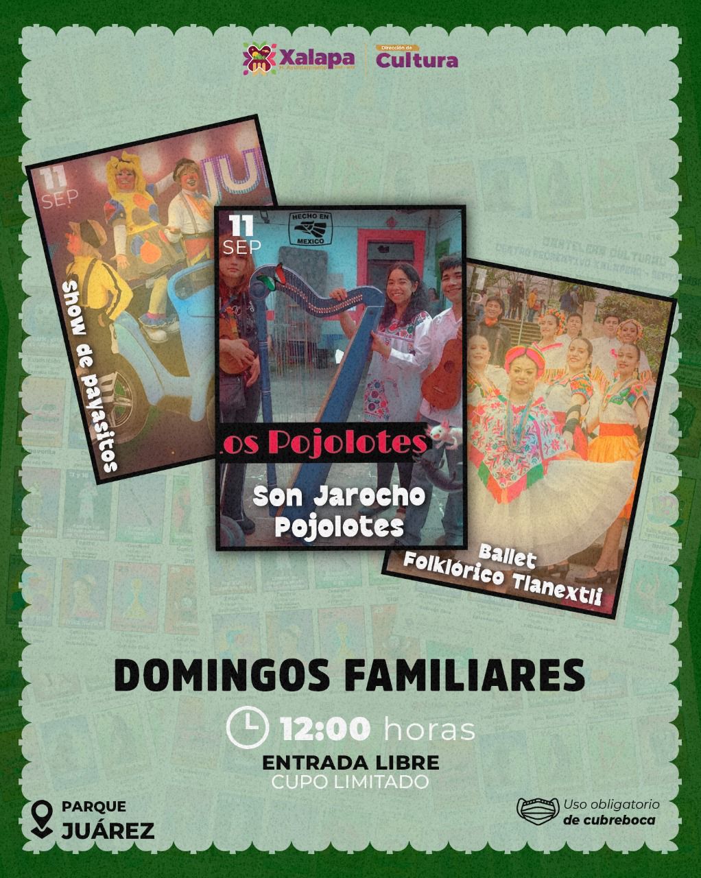 El 11 de septiembre, y continuando con los Domingos Familiares, habrá un programa infantil y el grupo de son jarocho “Los Pojolotes”, además del Ballet Folclórico Tlanextli; y en el Museo de la Música Veracruzana, Casa Doña Falla, a las 17:00 horas, el recital “Sonatas para Laúd”, a cargo de Silvius Leopold Weiss.