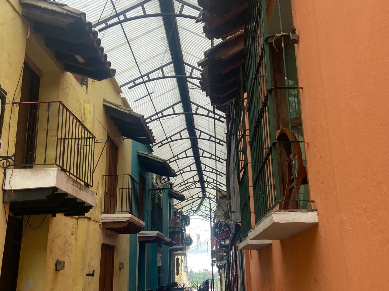 La luz natural hace relucir los tradicionales balcones coloniales con sus ventanales y sus profusas puertas de madera, que contrastan con las protecciones pesadas de fierro y con el enorme domo en acrílico que protege de las inclemencias del tiempo.
